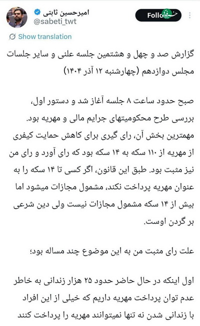 اخبارملل: تعداد زندانیان مهریه از سوی نماینده مجلس اعلام شد. امیرحسین ثابتی، نماینده مجلس شورای اسلامی در تهران نوشت: در حال حاضر ۲۵ هزار زندانی مهریه در کشور وجود دارد.